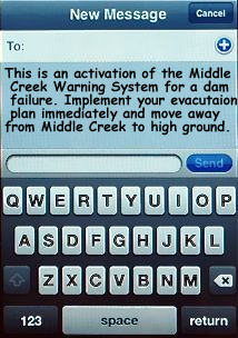 With the increased usage of cellular telephones in society today Gallatin County added the ability for people to register and receive text messages (SMS) and e-mail messages in the event of a middle creek dam failure. If a dam failure was to occur, you would receive a text message and/ or e-mail on any registered devices with the message of, “This is an activation of the Middle Creek Warning System for a dam failure. Implement your evacuation plan immediately and move away from Middle Creek to high ground.”
